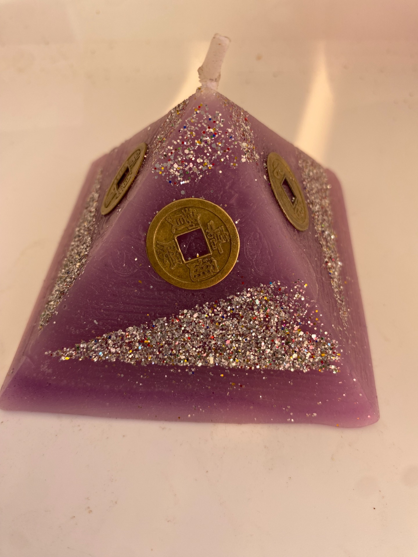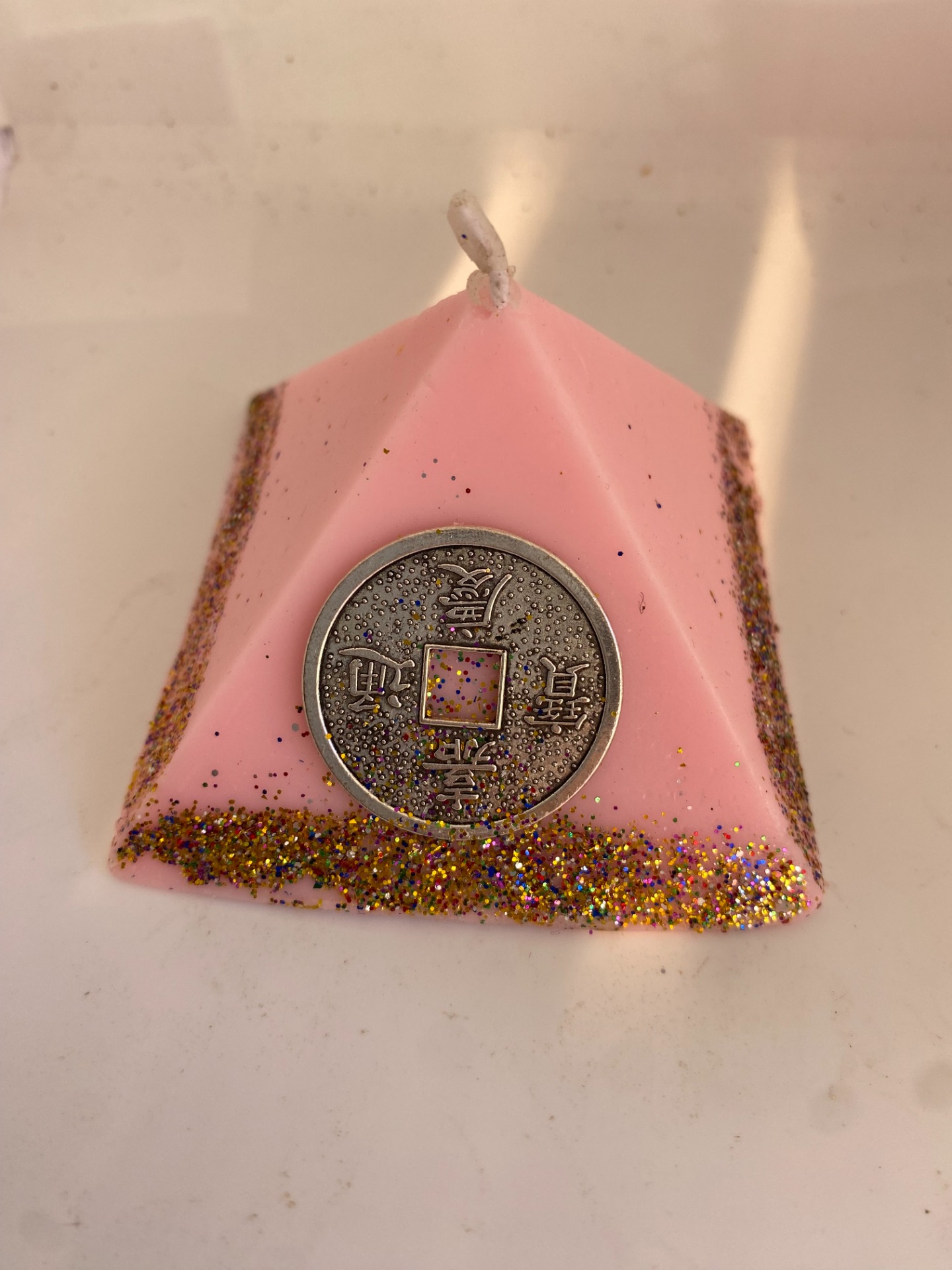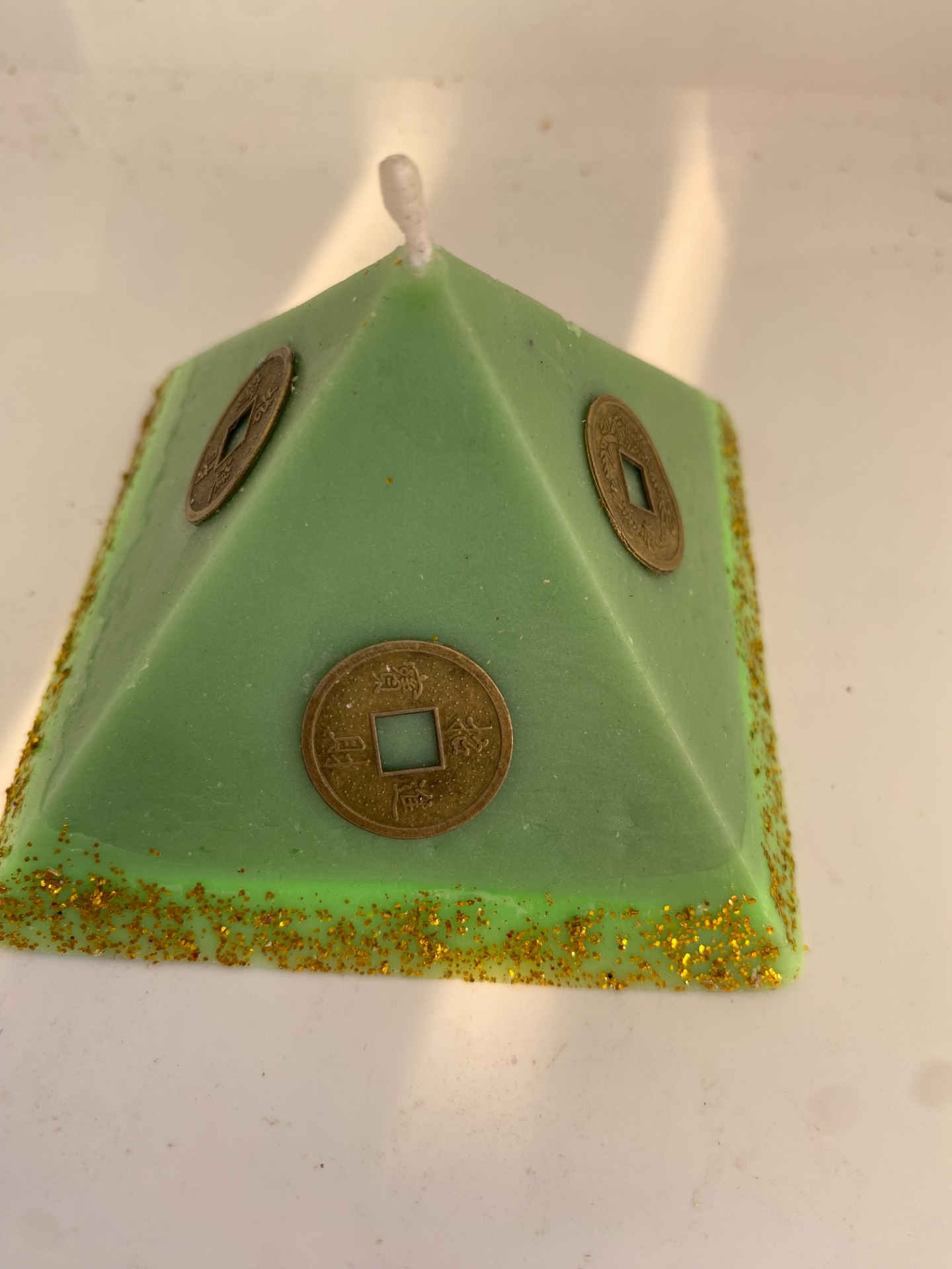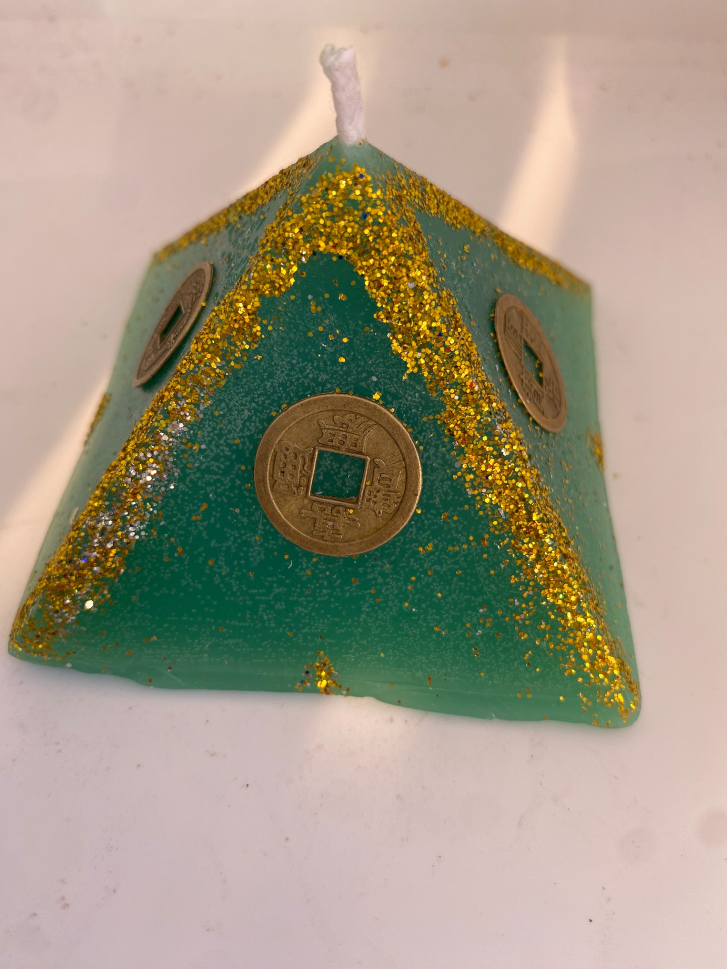 Una preciosa vela donde se combinan formas, decoración y no olvidemos que esta destinada a la prosperidad donde podrás hacer tu ritual escrito en nuestro blog vela pirámide prosperidad.