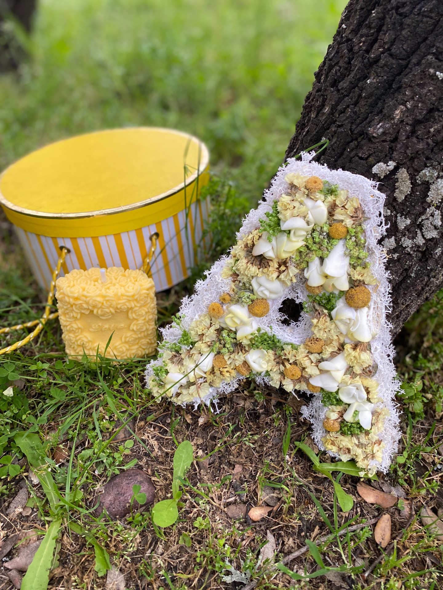 Letra pequeña A en color amarillo forrada el lateral de musgo blanco finlandés preservado.